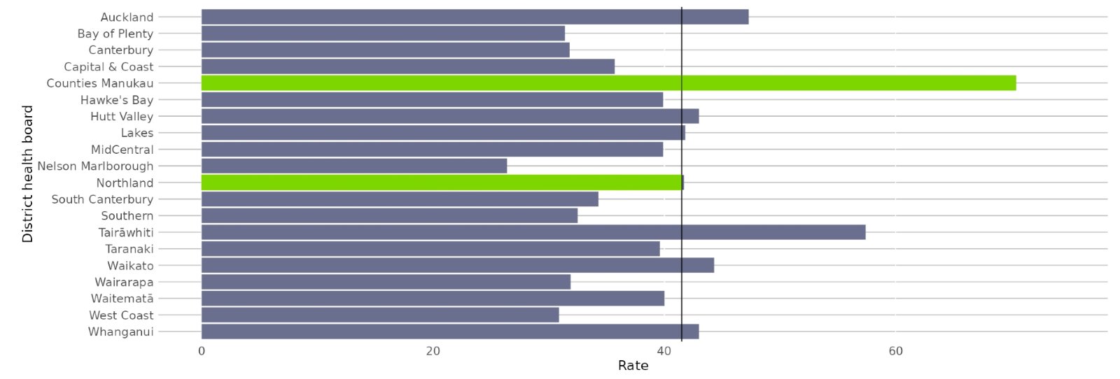 Rates are per 100,000 and age-standardised to the World Health Organization's standard world population. The national rate is shown by the black vertical line.