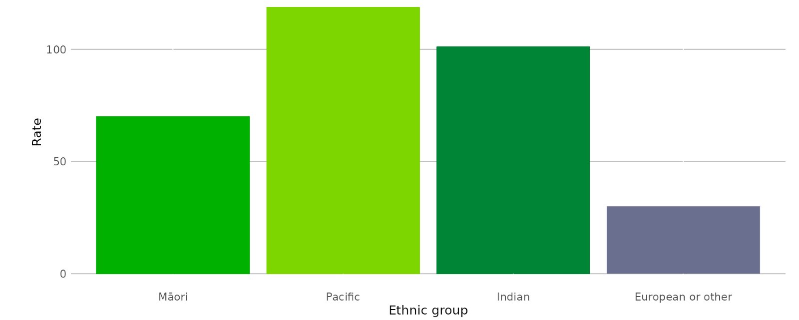 Both the local indigenous people Māori and the Pacifica people who have emigrated from the surrounding Pacific Island (Fiji, Samoa, Tonga and Niue) are over-represented in all disease and chronic illness compared to European (pakeha). This is especially true of diabetes where the immigrant Indian population also suffers very high rates (Figure 2).