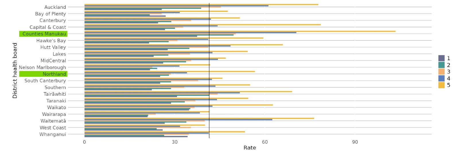 Figure 3: Estimated rate of diabetes per 1000 people, by district health board and deprivation quintile, 2021